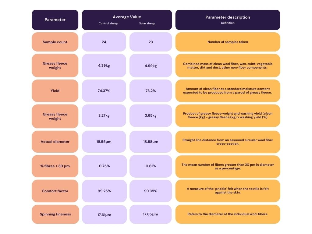 Through comparisons of two groups of merino sheep – one group grazed in a regular paddock and the other at the Wellington solar farm – the findings suggest that the co-location of solar farming with sheep grazing is not negatively impacting wool production, even in the case of pre-existing high-quality standards. Some parameters even indicate an improvement in wool quality, although conclusive benefits require further long-term measurement.