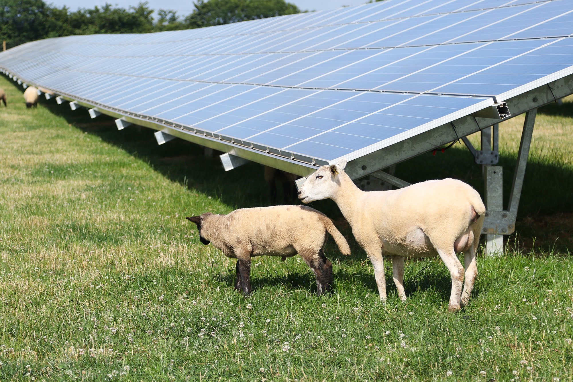 Sheep grazing on solar farms combines agriculture with solar electricity generation, enabling livestock to graze and crops to grow alongside and beneath solar panels.