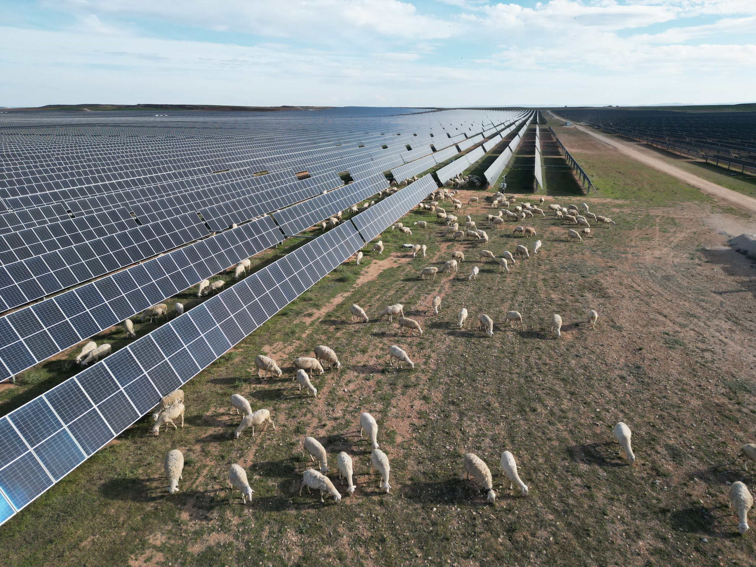 Sheep grazing on solar farms combines agriculture with solar electricity generation, enabling livestock to graze and crops to grow alongside and beneath solar panels.