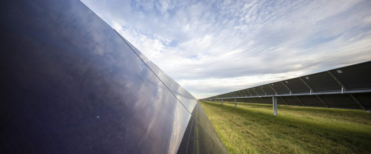 solar panels against a blue sky with white clouds, green grass and white flowers in the foreground