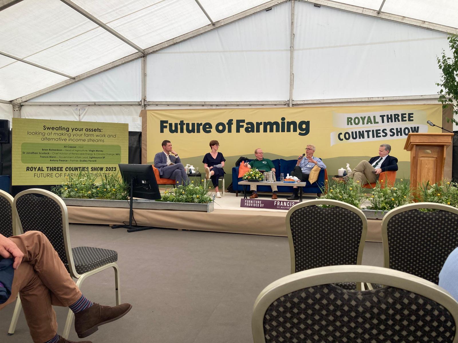 A recent example of the way in which we are working with farming communities is our sponsorship of the Future of Farming Zone at this year’s Royal Three Counties Show. We worked closely with the organisers to create a space where farmers could be inspired and empowered to drive their businesses forward. Since resuming our membership with the NFU earlier this year we’ve been working closely with them to drive forward best practise and so were proud to take part in a panel speaking discussion with Jonathan Scurlock of the NFU and other sponsors of the Future of Farming Zone covering solar’s role in farm diversification.