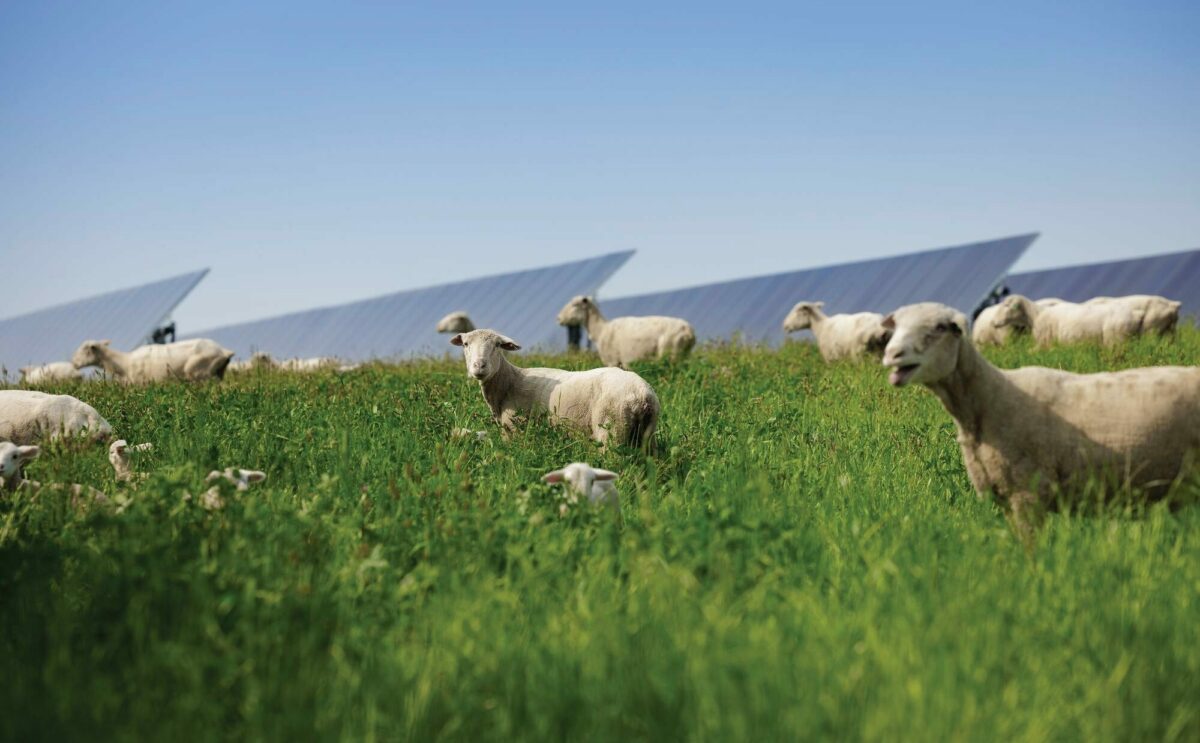 Sheep grazing on solar farms combines agriculture with solar electricity generation, enabling livestock to graze and crops to grow alongside and beneath solar panels.