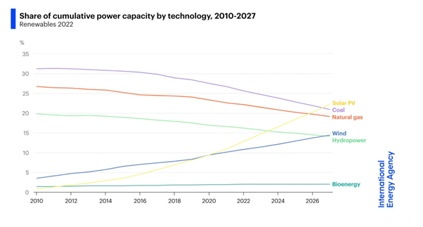 Finally, it appears that we’re approaching the tipping point. According to a recent report from the IEA, “photovoltaic solar capacity will exceed hydroelectric generation next year, gas in three years and any other source of energy, including coal, within four years”. By 2027, according to the IEA, solar will have overtaken all other sources of energy in terms of generation, world-wide.