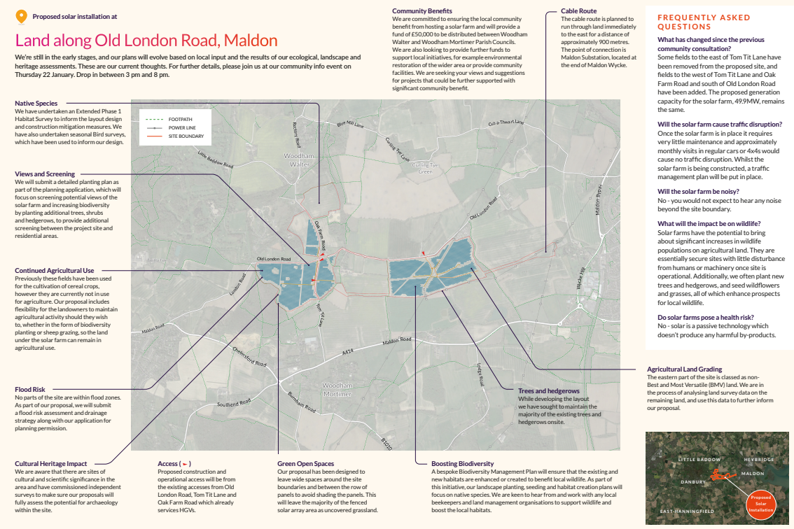 A key part of developing plans for the solar installation is engaging with local communities. We are holding our next community information event in Woodham Walter Village Hall on 22 January 2026, from 3pm to 8pm. Representatives from Lightsource bp will be on hand to answer any questions. Read our press release.