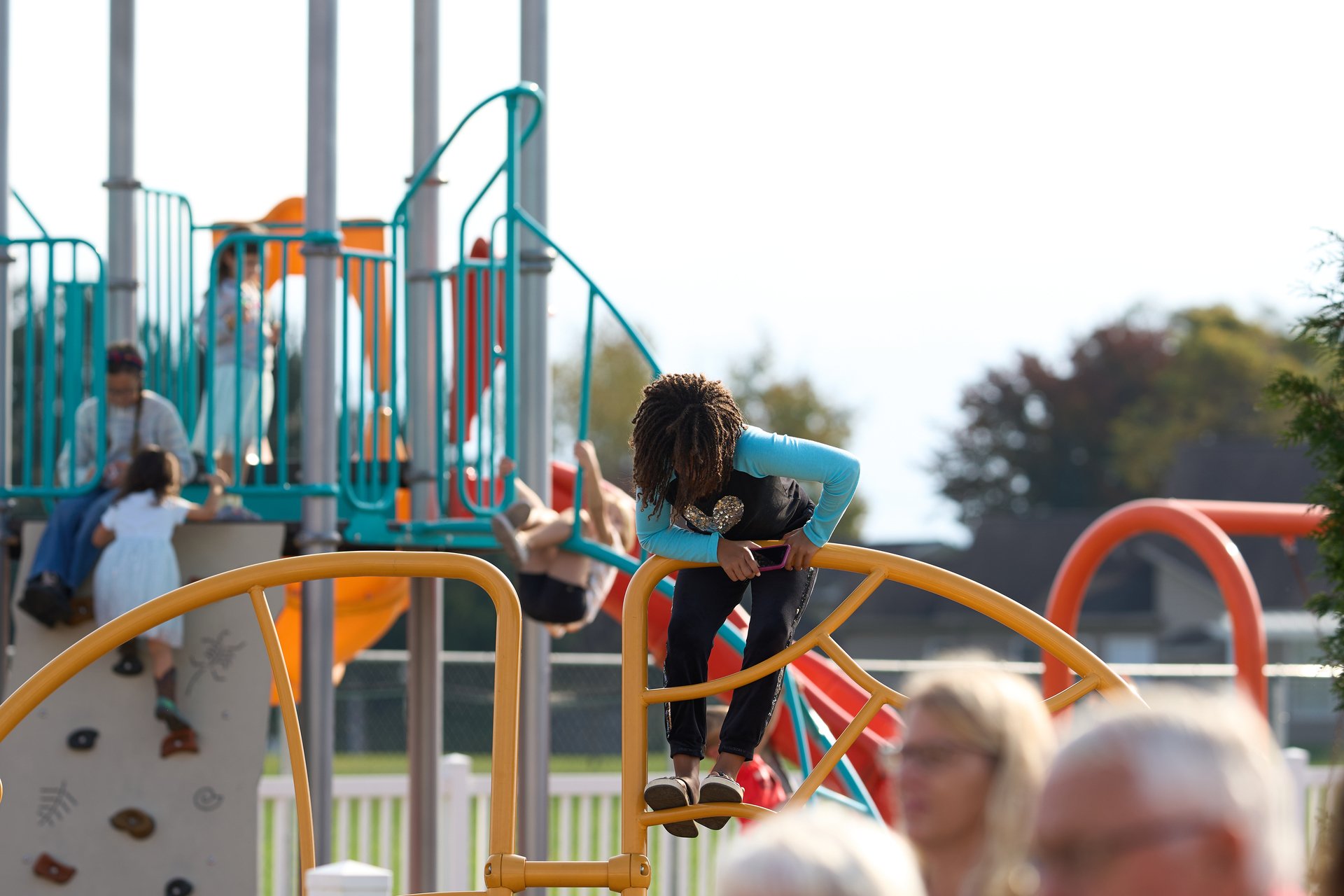 Kids enjoying Everyone’s Playground at a ribbon cutting celebration for the new comfort station