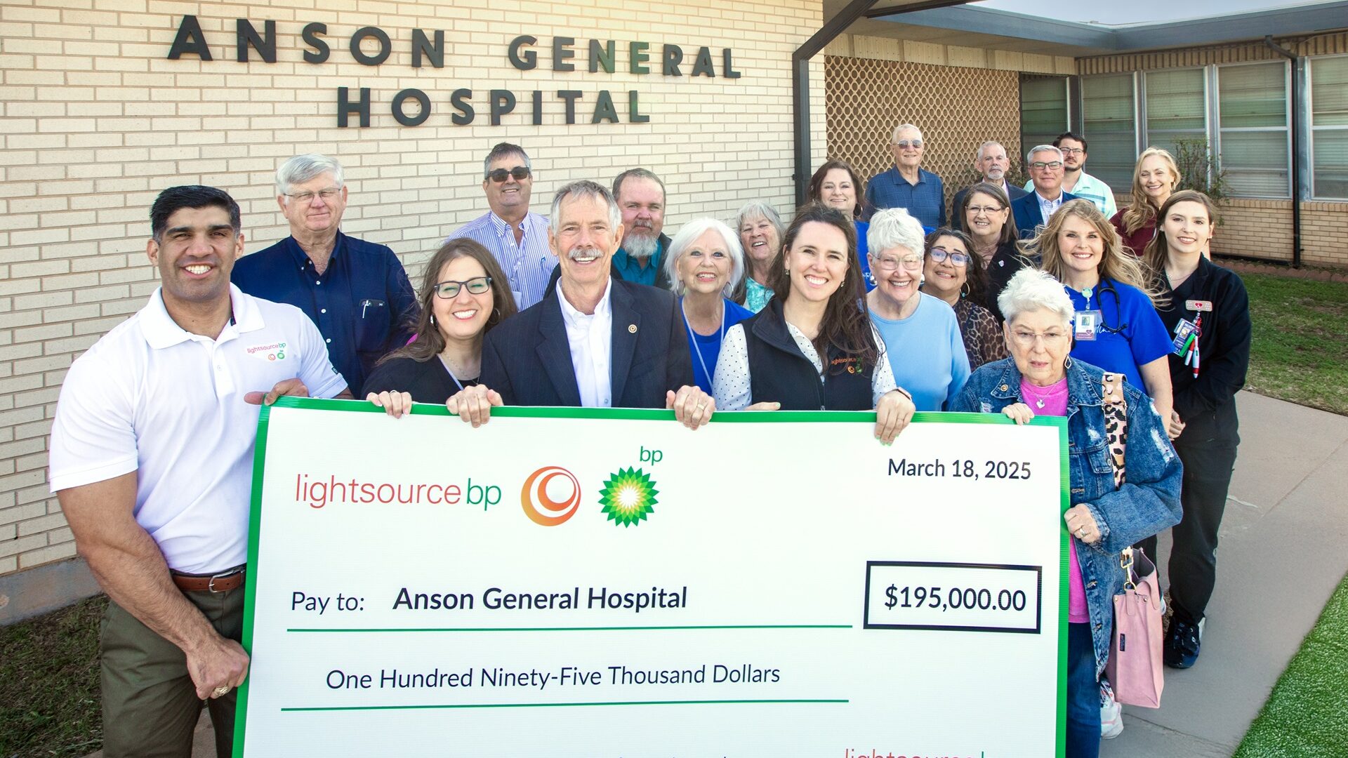 Lightsource bp recently presented a $195,000 check to Anson General Hospital, a small, federally designated rural emergency hospital in Anson, Texas. During the course of its 70+ year history, the hospital has maintained emergency and general care operations, even in the face of chronic financial challenges. It is the last remaining hospital in Jones County.