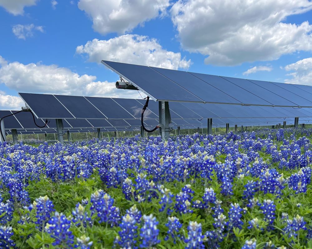- Native vegetation, including several types of grasses and Texas Bluebonnets grow under and around the solar panels.
